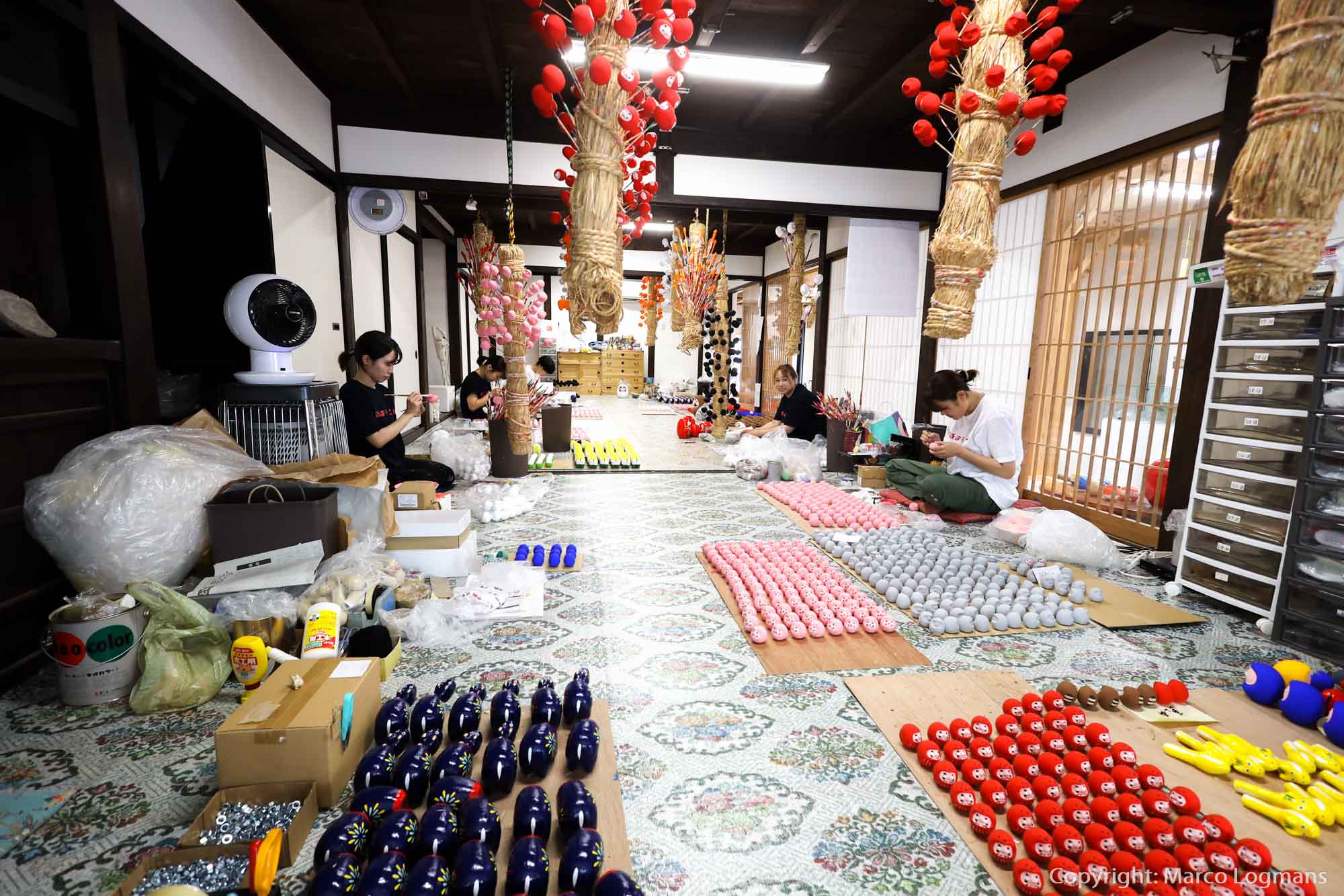 Japan kent verschillende ateliers waar de Daruma poppen worden gemaakt, en handmatig geschilderd. Een van deze ateliers is te vinden in Shirakawa (Fukushima), en heet Daruma Land: https://darumaland.jp/. Hier werken ze dagelijks aan het beschilderen van honderden daruma poppen. En dat allemaal op de Japanse manier: zittend op de grond.